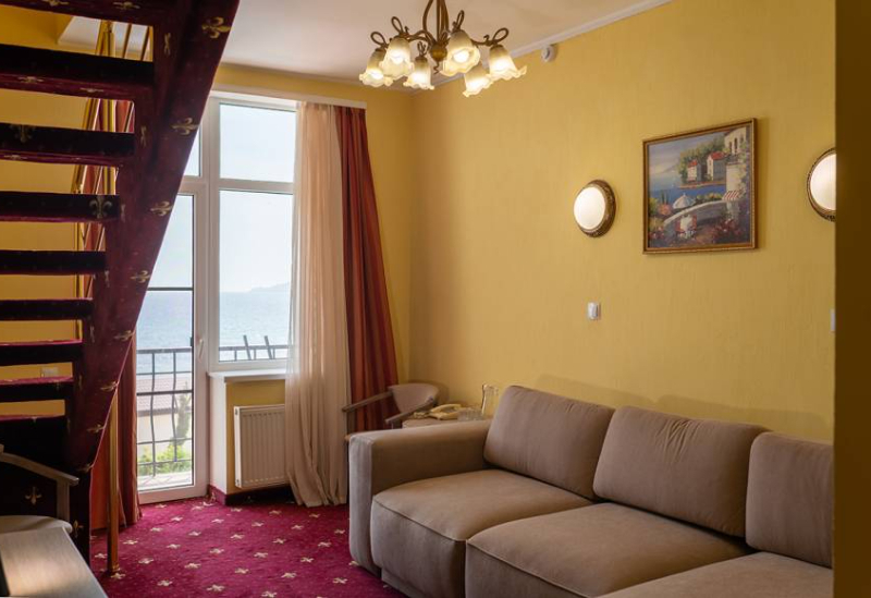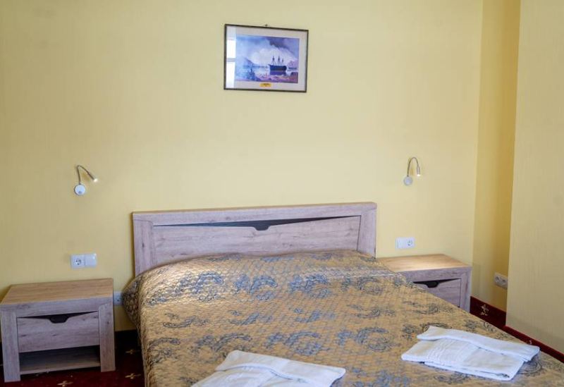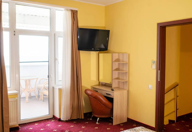 Площадь номера - 50 кв.м. 3 комнаты. 4 осн. места. все номера с видом на море. В номере: телевизор; холодильник; балкон; кондиционер; телефон; душ; туалет; фен; сейф; 2-спальная кровать; 1-спальные кровати; диван. 2 доп. места: Диван-кровать - может быть предоставлен без ограничения по возрасту.
